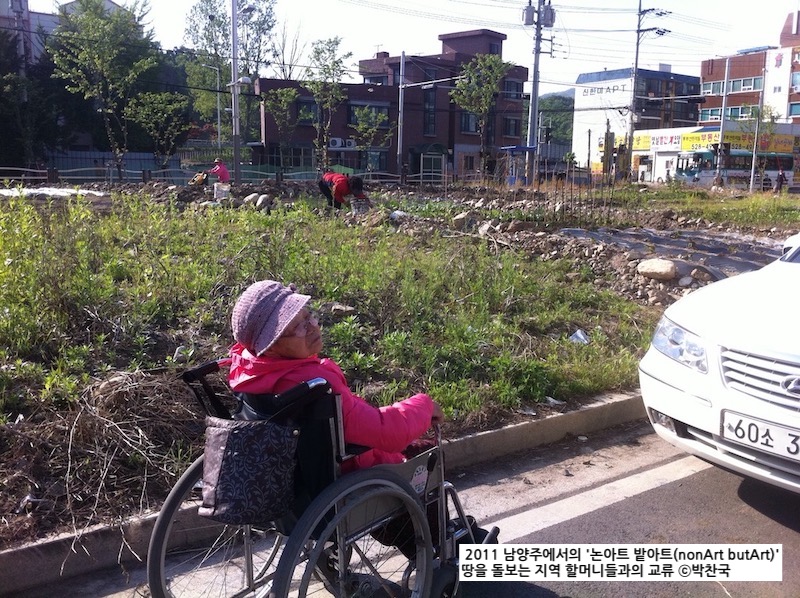 A. 하나의 예를 들어 볼게요. 제가 2011년 남양주에서 ‘논아트 밭아트(nonArt butArt)’ 할 때입니다. 도시개발공사와 같은 곳에서 땅을 사 다져놓고는 공사 전에 분양을 받죠. 몇 년간 비어진 그 땅에 몇 할머니들이 농사를 짖고 싶어지신 거예요. 이 땅은 풀이나 식물이 자라지 못하게 하려고, 자갈을 잔뜩 넣어 다진 곳이거든요. 그런데 이 할머니들이 호미 하나만을 들고 가서 땅을 파는 거예요. 할머니들이 어릴 때 척박한 곳에서 땅이 없으니까 뭐라도 했던 경험이 있으니까요. 이건 굉장히 중요한 거죠. 어떤 상황이 벌어지냐면, 돌을 마치 발굴처럼 골라내요. 이 돌을 옆으로 골라내서 양쪽 사이즈에 계속 쌓아서 제주도 돌담처럼 되는 거예요. 휠체어에 있는 할머니, 농사짖는 할머니, 딸과 손녀. 그 할머니들이 땅을 파서 이렇게 하는 거를 내가 옆에서 보고 그거를 이제 우리가 컵하고 그냥 화분 그걸 가지고 갔죠. 그 땅을 파려면 깊이 다져놓은 땅이라 너무 힘들어요. 그러니까 우리는 종이컵 같은 걸 가져다 밑을 자르고 나서 거기다 흙을 담아 바질 등을 심어요. 식물의 뿌리가 내려가서 돌들 사이를 타고 스스로 내려가게 하는 방식으로 심겠다는 건데 다 잘 자랐는지 아닌지는 몰라요. 그런데 어쨌든 할머니는 우리가 꽃을 심어준다고 정말 좋아하는 거예요. 그래서 이걸 할머니들과 같이 하면서, 봄에 놀았거든요. 그건 뭐 프로젝트도 아니고 아무것도 아닌데, 할머니들 만나서 너무 흥미로운 거죠. 그런데 그분들에게 이건 어떤 삶의 방식인 거예요. 그때 찍은 사진이 한 장 있고 글도 하나 있어요. 사진을 보면 옆에 쌓인 돌들이 있는데 그게 땅의 깊이로 보여지죠. 이런 경험은 여성들의 가사 노동이라는 맥락에서 가능했던 거예요. 일반적으로 생각하는 이익이나 효용을 위해서는 그런 밭을 만들 수가 없죠. 우리의 방식으로는 그렇게 비효율적이고 강한 노동을 수반하는 데다가, 내년에 쫓겨날지도 모르는 일을 하지는 않아요. 그런데 그 할머니들에게는 그냥 삶의 방식이에요. 그게 얼마나 마트보다 저렴하냐는 관점이 아닌 거죠. 그런 관점과 경험을 어떻게 환기하느냐가 제 프로젝트의 목적인 셈이지요.